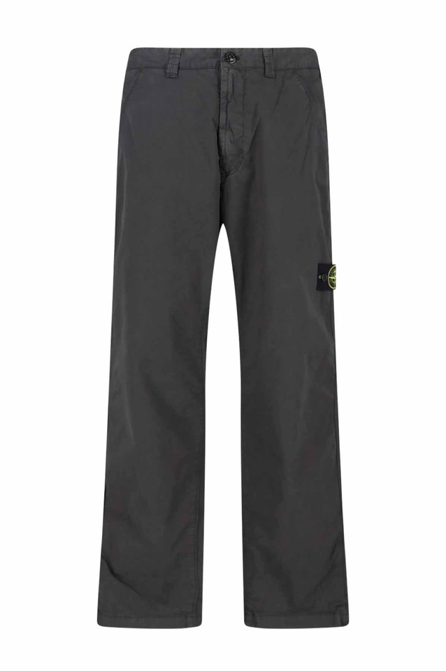 STONE ISLAND 3100035 Stretch Organic Cotton Twill Trousers Lead Grey. Chino trousers in stretch organic cotton twill. Garment dyed. Slanted hand pockets. Back patch pockets with snap. Stone Island badge on left leg. Zip and button fly. Regular fit.