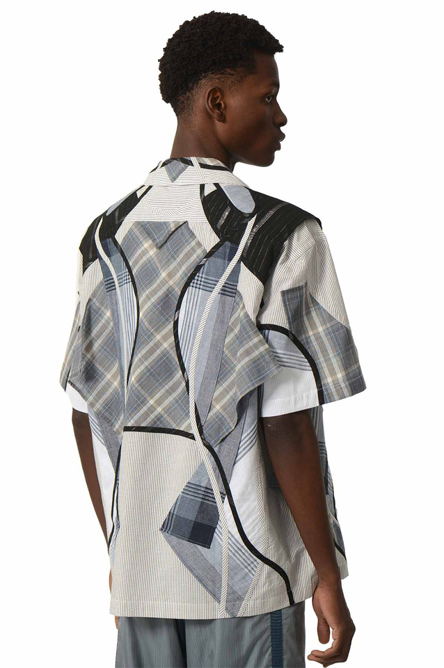 CRAIG GREEN Chemise patchwork bleu. Chemise à manches courtes en coton bleu, construction en patchwork et multicouches, col bowling, fermeture par bouton sur le devant, manches courtes, empiècement au dos, ourlet droit.