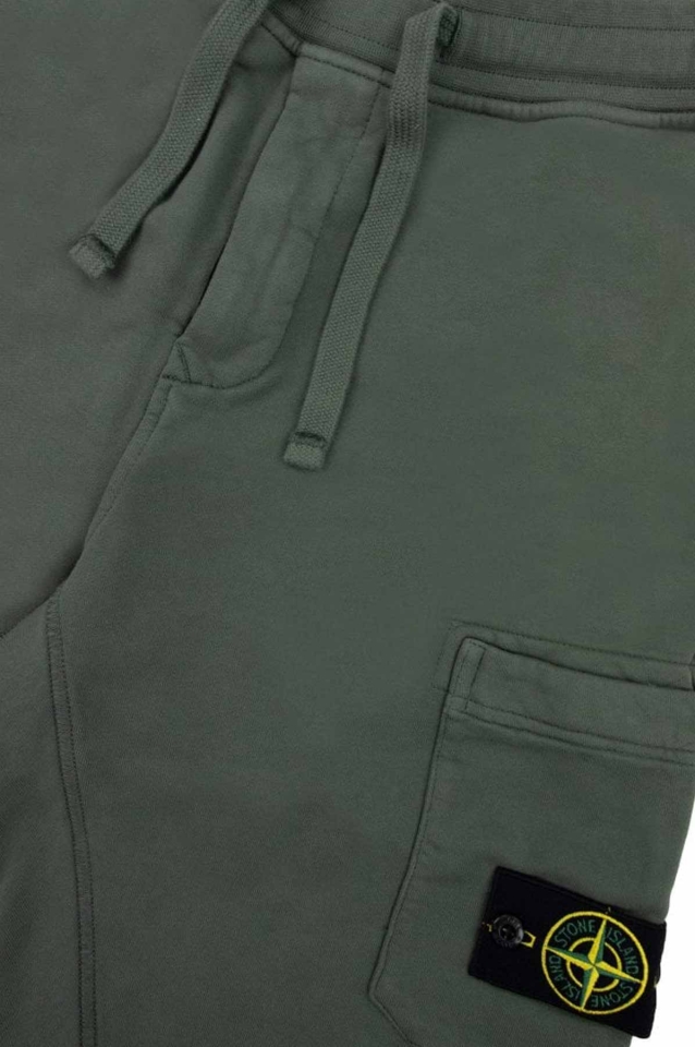 STONE ISLAND 6200011 Organic Cotton Fleece Shorts Juniper Green. Bermuda shorts in organic cotton fleece, featuring a zip pocket on the left leg, back flap pocket, and elasticated drawstring waistband with zip fly. Garment dyed. Standing hand pockets. One pocket on back with fixed flap and hidden snap. Patch pocket on left leg with hidden zip and Stone Island badge. Elasticated waistband with drawstring. Zip fly. Overlock seams. Regular fit.